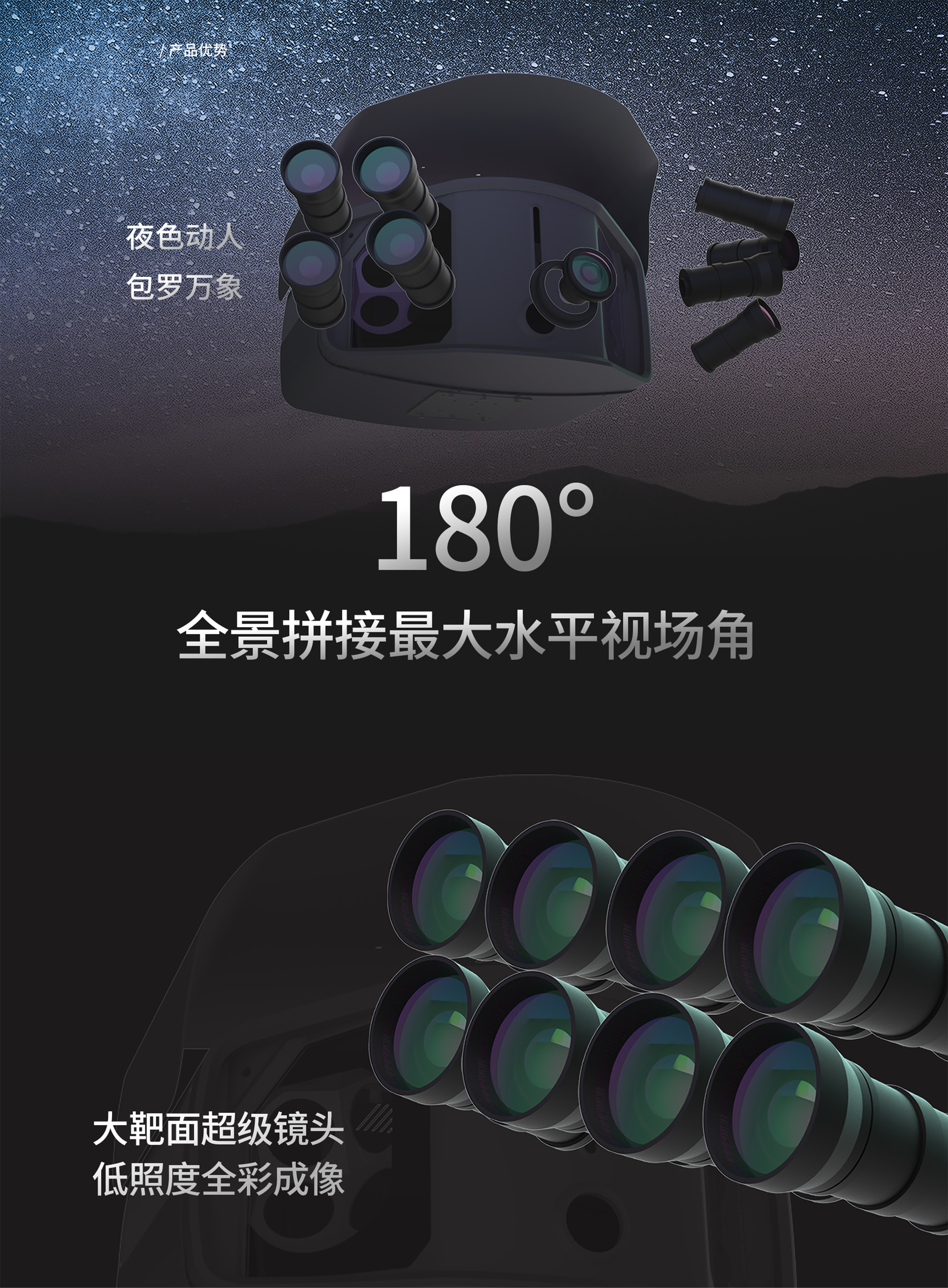 黑光智能阵列相机采用高通光量镜头搭配超大靶面图像传感器,提供全彩级夜视效果,满足应用场景下24小时全天候监控需要。8K级复眼超融合,支持无损传输,精细还原图像细节。内置高性能AI处理器,可提供8Tops算力。180°超大水平视角,适用于机场、港口码头、边海防等开阔场景的全视野实时监控。